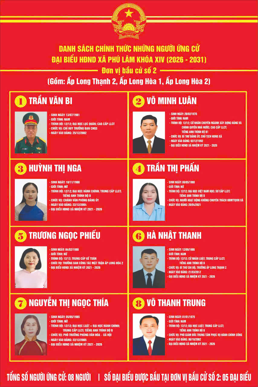 Bầu cử Hội đồng nhân dân Danh sách chính thức những người ứng cử đại biểu HĐND xã Phú Lâm khóa XIV (2026 - 2031) - Đơn vị bầu cử số 2 02/03/2026 - aA + Submitted by Administrator on 2 March 2026 Bài viết liên quan Danh sách chính thức những người ứng cử đại biểu HĐND xã Phú Lâm khóa XIV (2026 - 2031) - Đơn vị bầu cử số 1 02/03/2026 Danh sách chính thức những người ứng cử đại biểu HĐND xã Phú Lâm khóa XIV (2026 - 2031) - Đơn vị bầu cử số 3 02/03/2026 Danh sách chính thức những người ứng cử đại biểu HĐND xã Phú Lâm khóa XIV (2026 - 2031) - Đơn vị bầu cử số 4 02/03/2026 Danh sách chính thức những người ứng cử đại biểu HĐND xã Phú Lâm khóa XIV (2026 - 2031) - Đơn vị bầu cử số 5 02/03/2026
