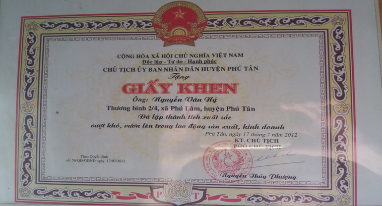 Đến năm 2010 địa phương xét thấy hoàn cảnh gia đình Chú thật sự quá khó khăn, riêng Chú là một Thương binh và cũng là một công dân ưu tú biết chịu thương, chịu khó, nên đã giới thiệu Chú tham gia Ban chấp hành của Hội Cựu chiến binh và được tập thể Chi hội bầu chú làm Chi hội Trưởng Hội Cựu chiến binh ấp Phú Thuận B, đồng thời được Ban xóa đói giảm nghèo xã Phú Lâm xét cho chú thuộc diện hộ nghèo để có thể chăm lo thêm một phần cho cuộc sống của gia đình chú.