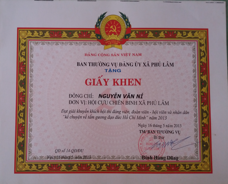 Giờ đây việc nhà đã ổn, chú càng tích cực hơn trong công tác, sẵn sàng nhận và hoàn thành tốt mọi nhiệm vụ được giao, thường xuyên tham gia tuyên truyền, giáo dục Hội viên tự giác trao dồi, rèn luyện bản chất truyền thống Bộ Đội Cụ Hồ; vận động thanh niên thi hành nghĩa vụ quân sự; kịp thời giúp đỡ Hội viên khi gặp khó khăn…Nên nhiều năm liền nhận được giấy khen đạt thành tích hoàn thành xuất sắc nhiệm vụ trong công tác Hội.