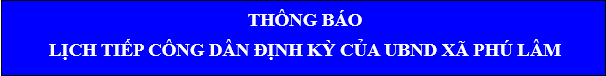 Lịch tiếp công dân THÔNG BÁO LỊCH TIẾP CÔNG DÂN ĐỊNH KỲ 09/05/2024 - aA + Submitted by Biên tập viên on 9 May 2024 Bài viết liên quan Lịch tiếp công dân 04/11/2025 Lịch tiếp dân của Bí thư Đảng ủy Phú Lâm 30/10/2025 Nội dung đang cập nhật 30/05/2023
